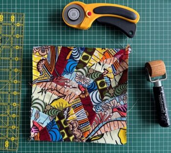 *rol-mes met scherp mes, quilt lineaal, evt. een 1/4″ geel lineaaltje (add a quarter lineaaltje,) en snij-mat